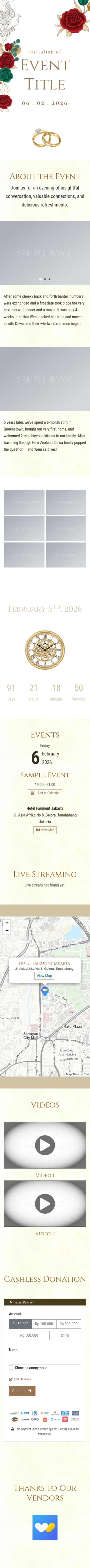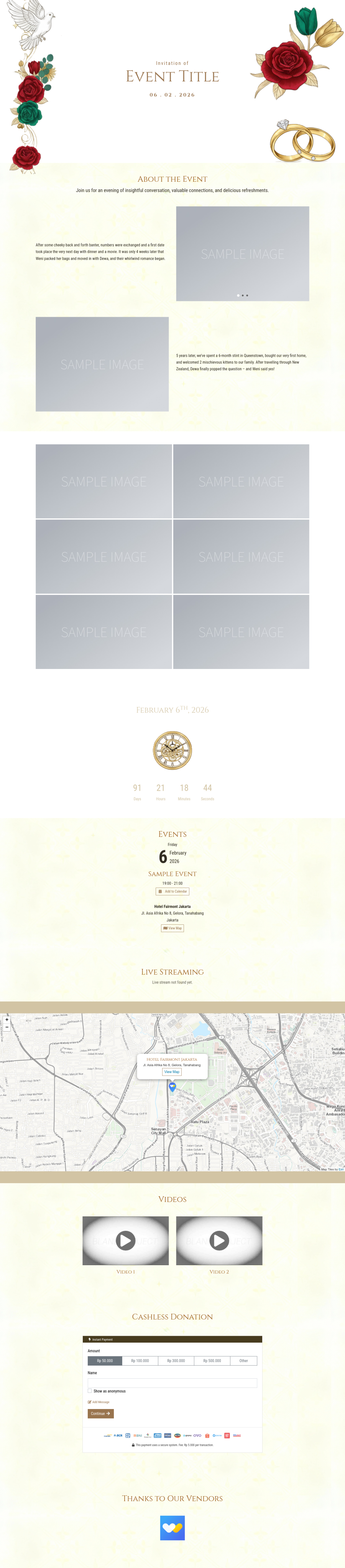 Temukan keindahan cinta abadi dalam balutan nuansa klasik yang mewah. Dengan sentuhan warna emas, mawar merah, dan hijau zamrud, tema ini memancarkan kesan romantis, hangat, dan elegan.